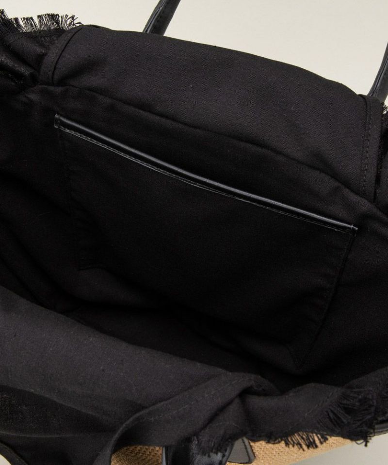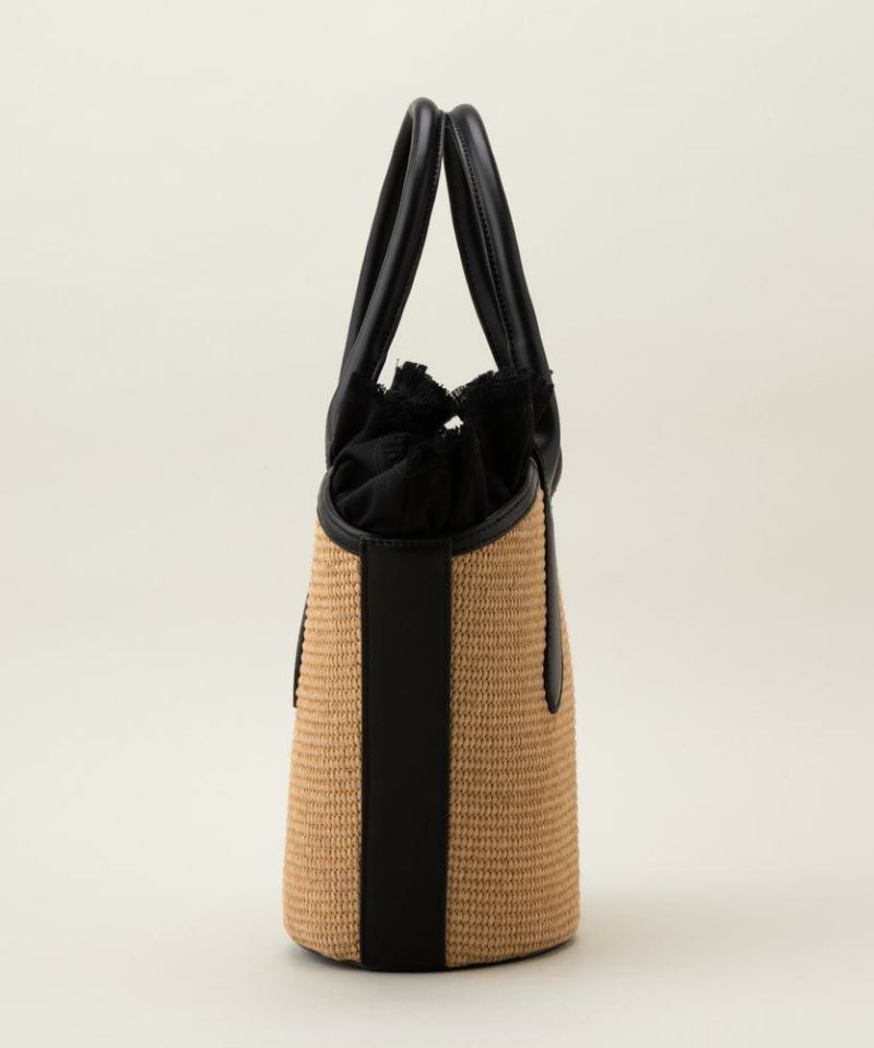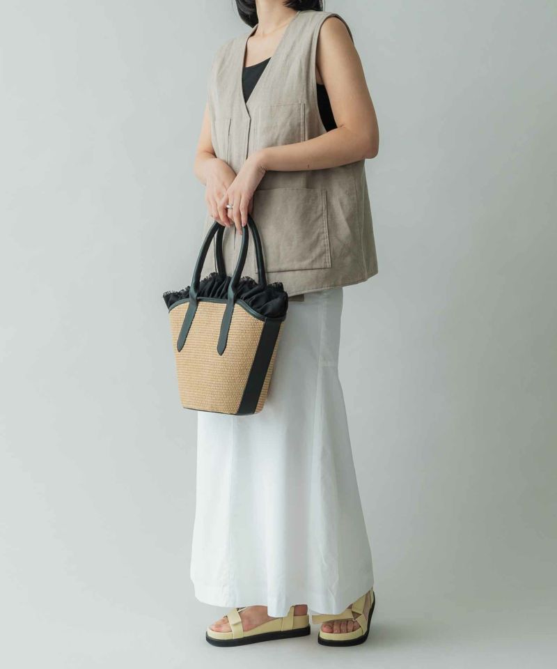 シート状で強度のある雑材風の素材をメインに裏地は麻風素材を使用しております。 カジュアルな印象になりがちな雑材風バックを、太めにとったフレームと本体に硬さを出すことで、軽やかさと重厚さをミックスし、目を惹くデザインに。 内装のポケットサイズは、スマホが出し入れしやすいサイズです。