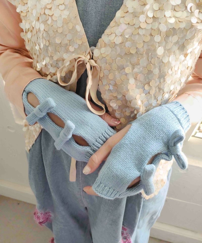 リボンニットとグローブを重ねてつけても、リボンニットだけをアームウォーマーのようにつけても◎