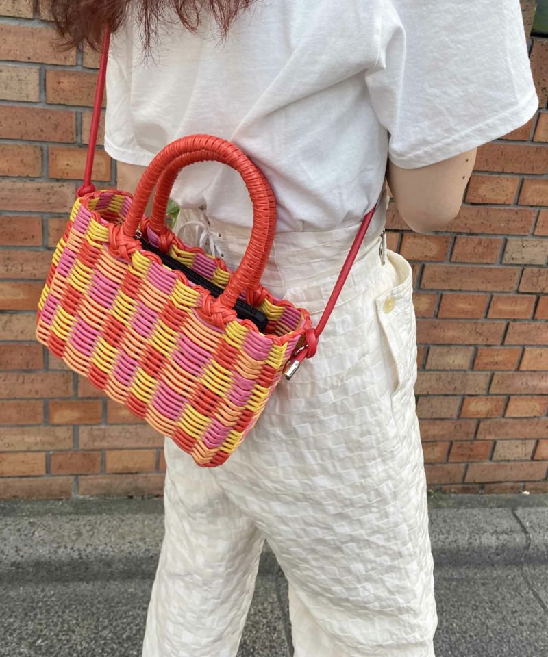 チェック柄のように編んだかごバッグはカラフルな色がコーディネートのポイントに。