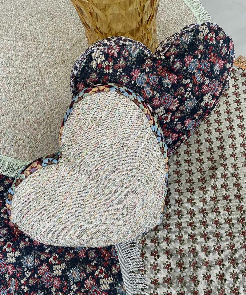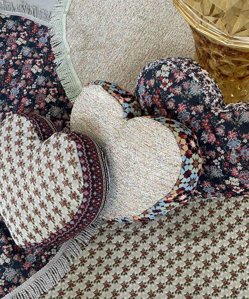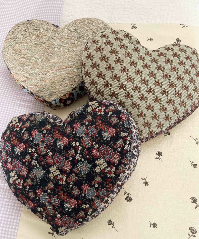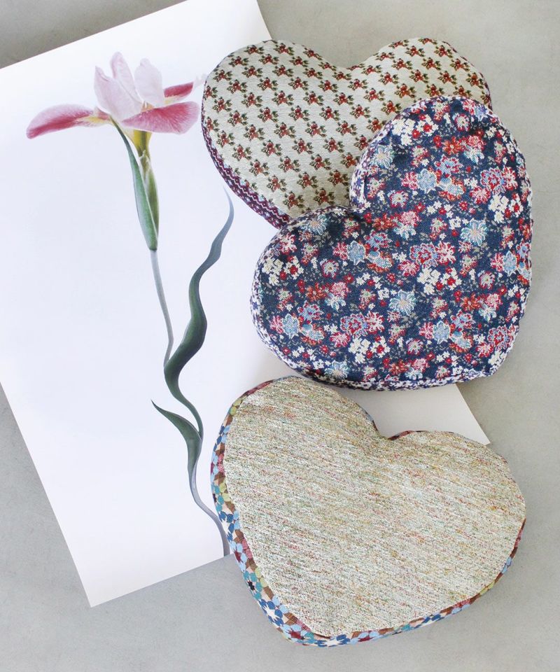 トレンド感のあるジャガード生地がかわいいハート型のクッションは、雰囲気の異なる柄違いの組み合わせがポイント。