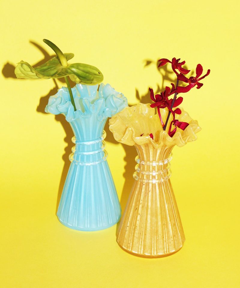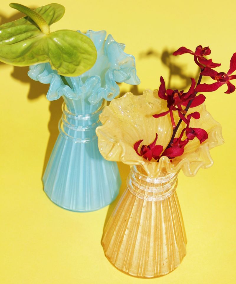 鮮やかなカラーとアンティーク調のシルエットが特徴的なガラス製フラワーベース。