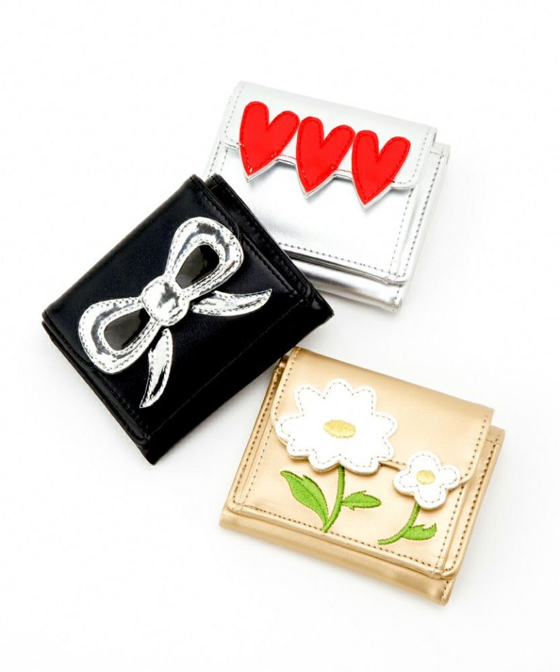 フロントパネルにはアイコニックなリボンやハート、フラワーモチーフが。内側のバイカラーデザインもポイントです。