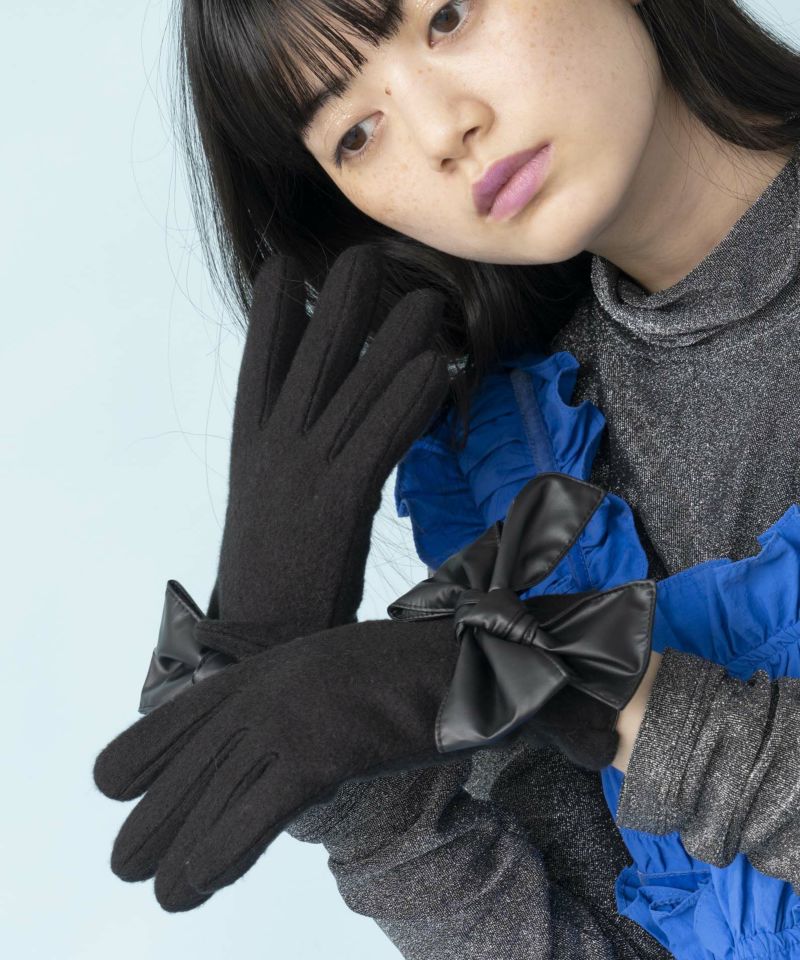 本体は肌触りの良いニット素材を使用しています。 指に隙間なくフィットし、手を温めてくれます。 リボン部分はとても薄くて軽い合皮素材を使用し、甘くなりすぎないノットデザインのリボンに仕上げているのが一番のポイントです。 親指と人差し指にスマホ操作対応可能な刺繍を入れています。 大きな手元のリボンがシンプルになりがちな冬のコーディネートのアクセントになること間違いなしです。