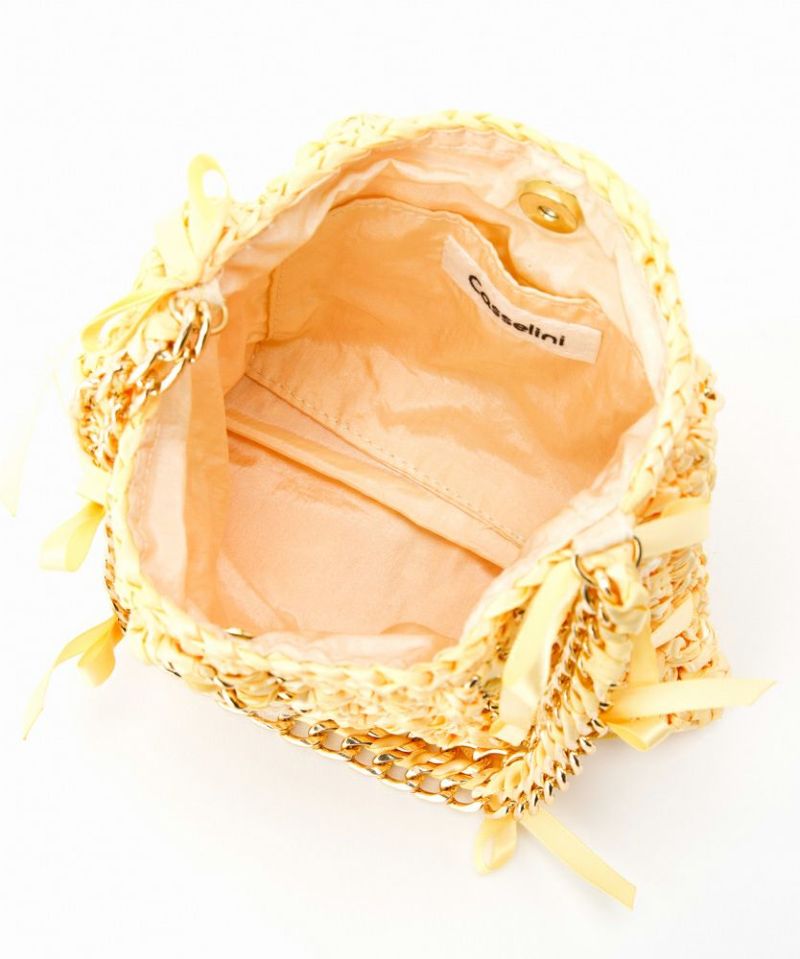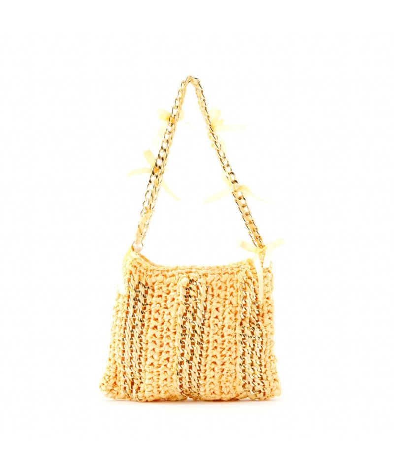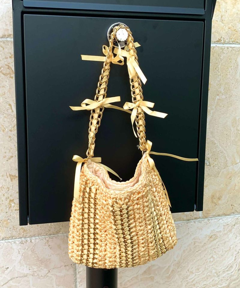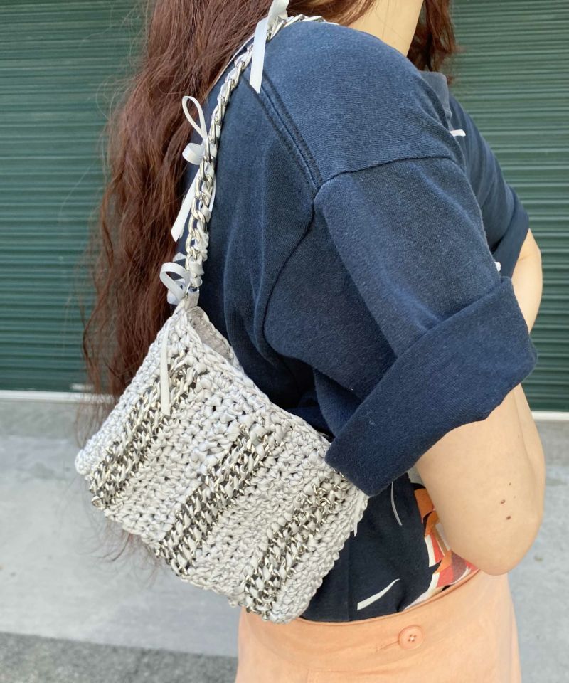 光沢感のあるサテンリボンとメタルチェーンを使用したハンドバッグ。