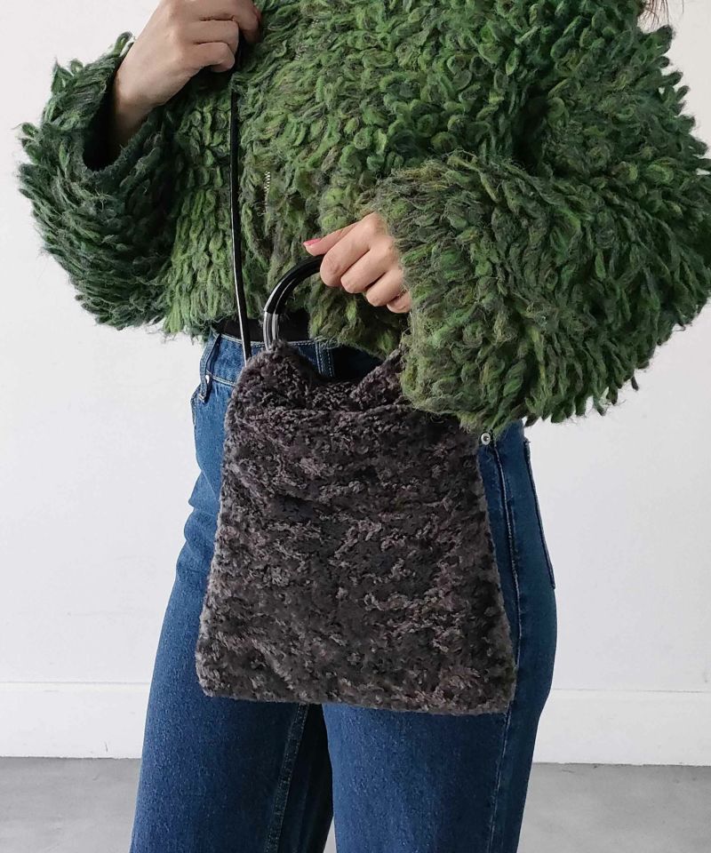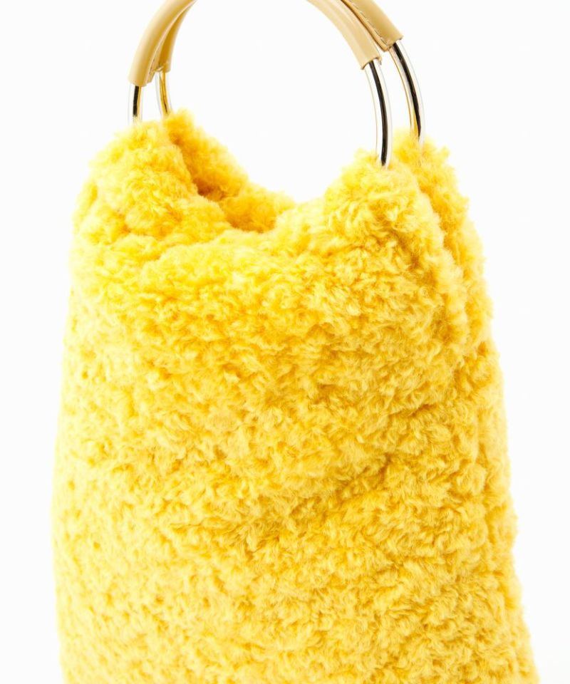 フワフワのカラーファーのボディにメタルのリングハンドルがポイント。
