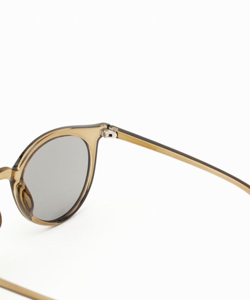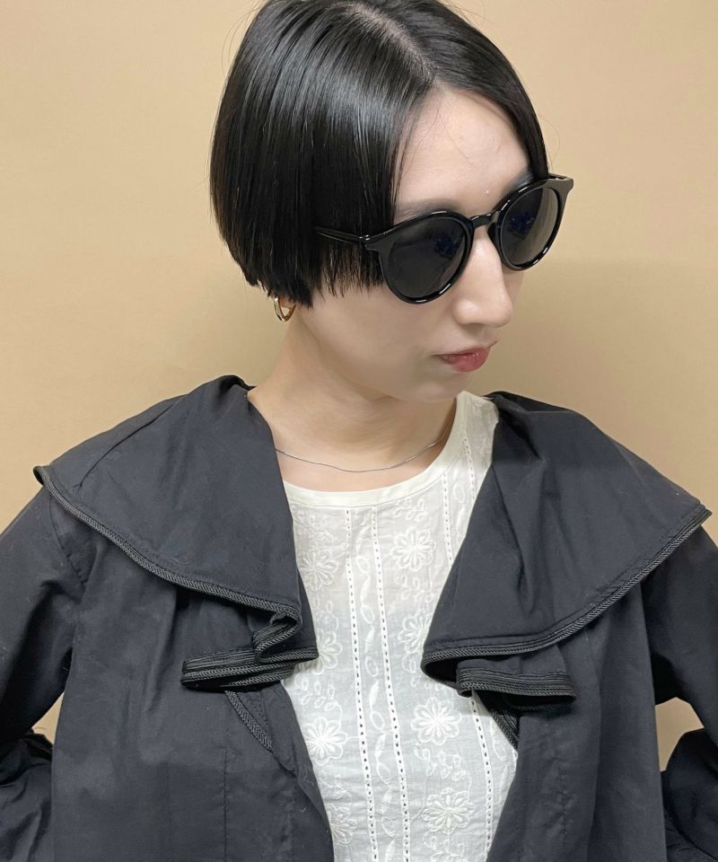 細いフレームにカラーレンズのスタイルが普段のコーディネートにプラスするだけで雰囲気のあるスタイリングに。