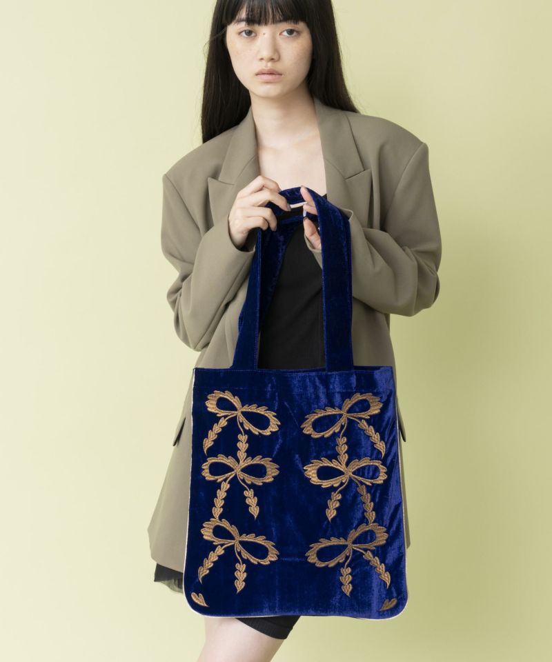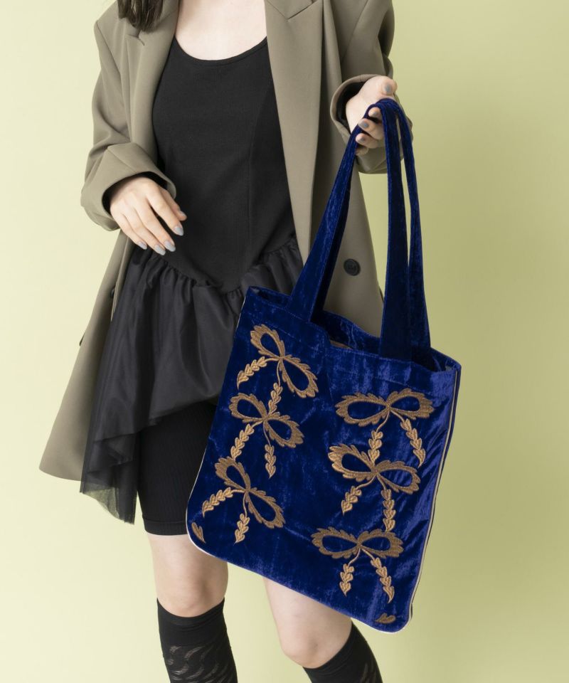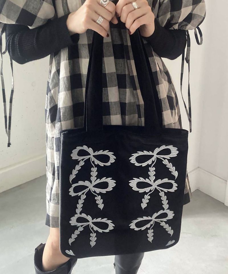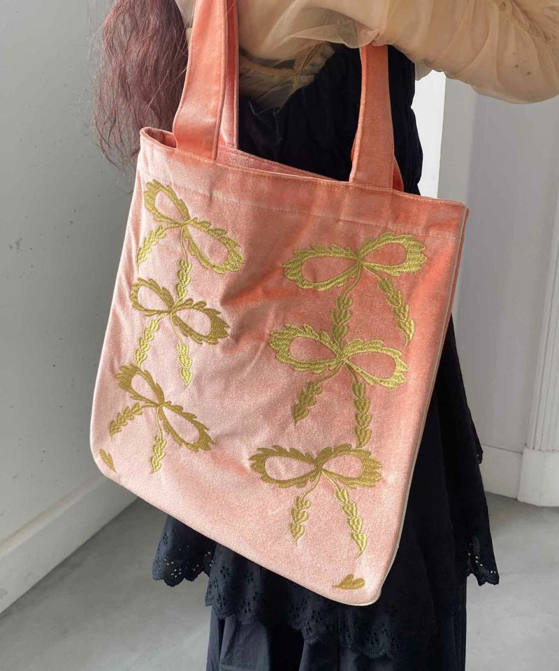 リボンたくさんのデザインに一目惚れして購入しました。最近流行りのリボンモチーフですが、刺繍とベロア素材で綺麗めの服にも合わせやすく長く使えそうです!持ち手が太いところと中に仕切りがあるのも機能的で気に入ってます( ¨̮ )