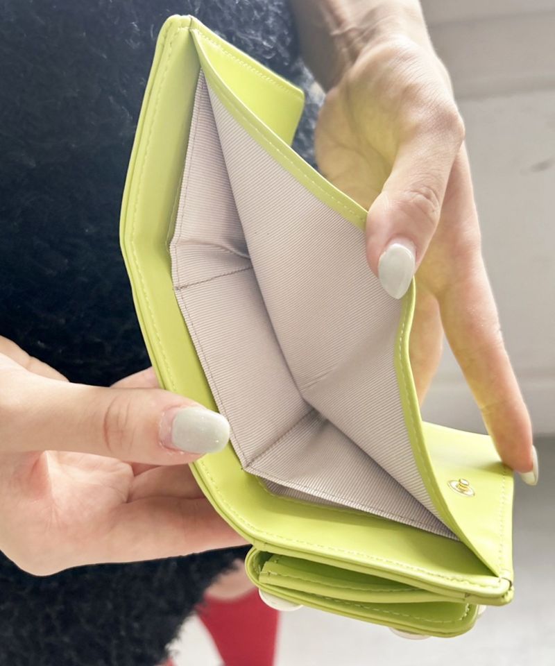 ライムグリーンが春らしくてお気に入りです。現金とカードもしっかり入るのに、コンパクトなのが嬉しいです。