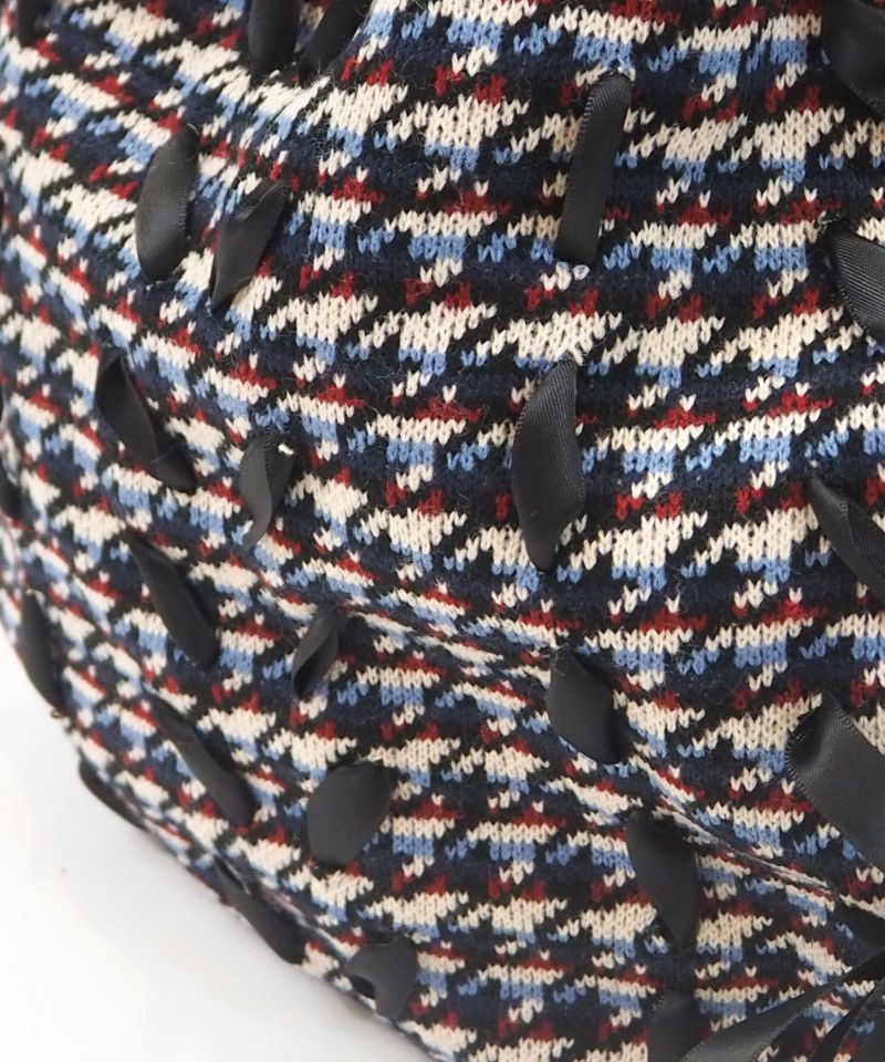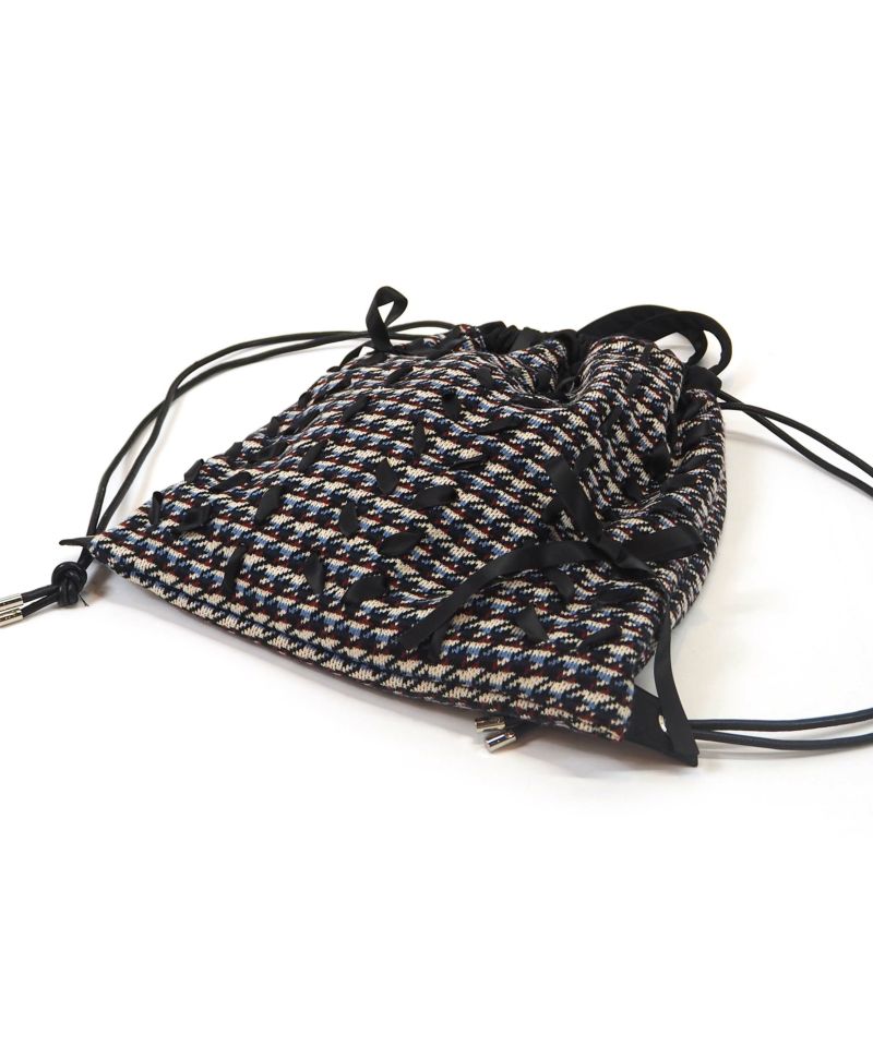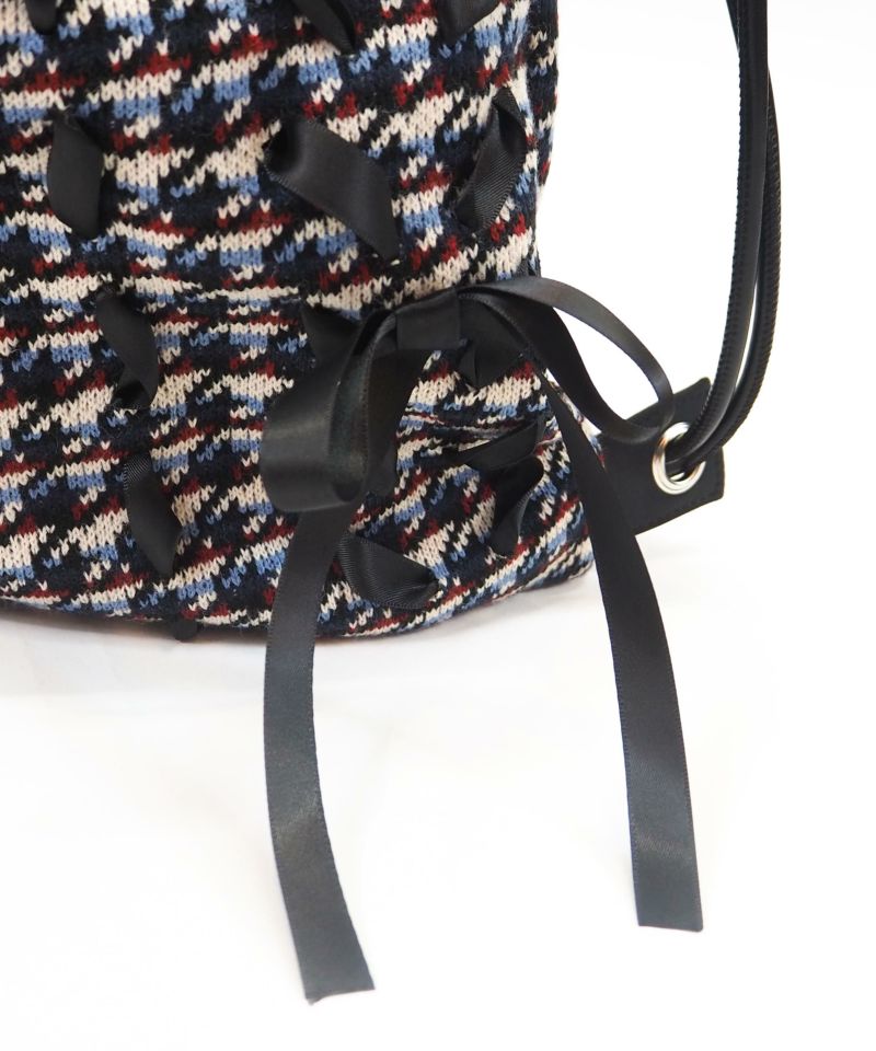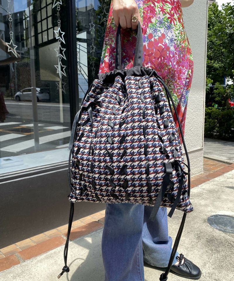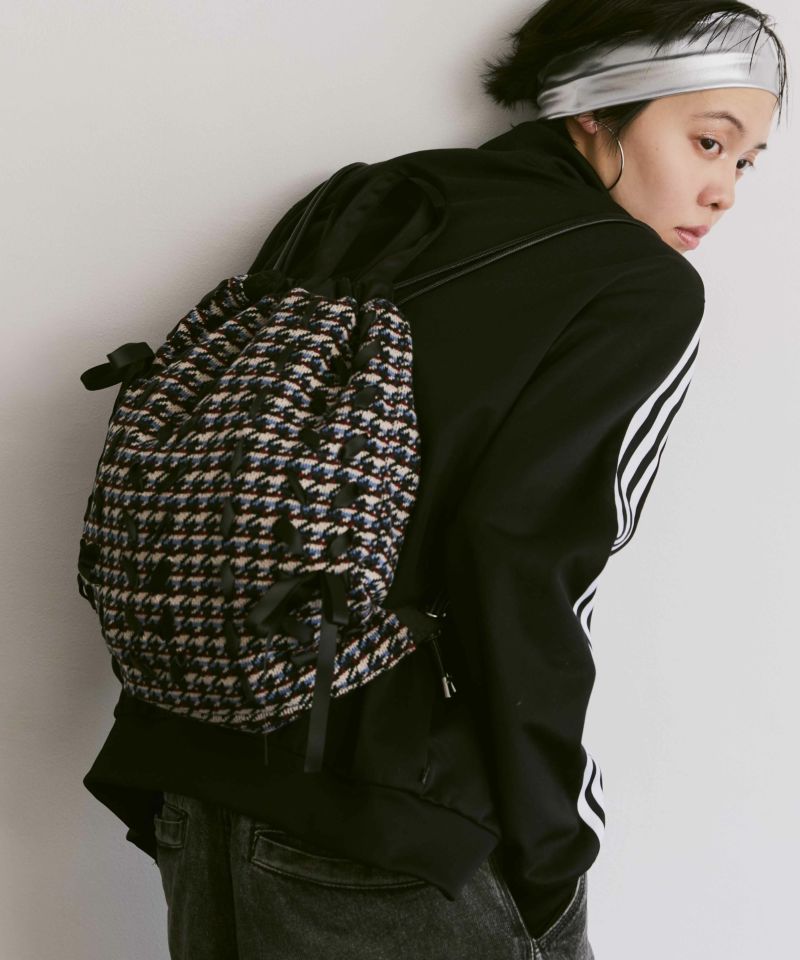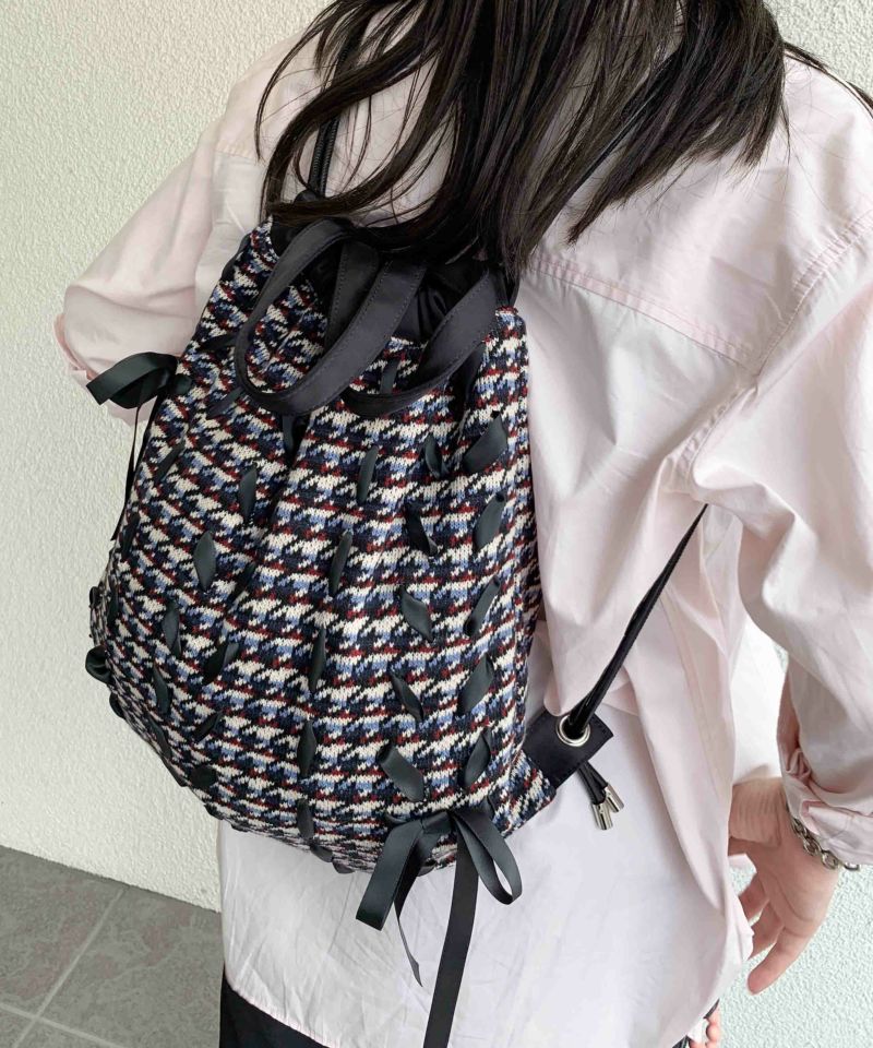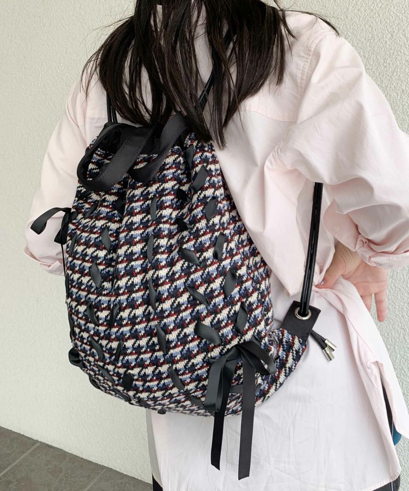 フロント全体にリボンが編みこまれたボーダー×千鳥格子柄が可愛いナップサック。