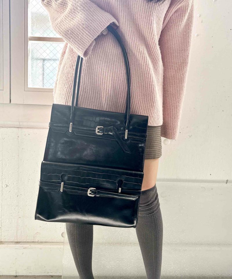 シルバーは単色展開、ブラックはクロコ素材とコンビにしており異素材MIXに。