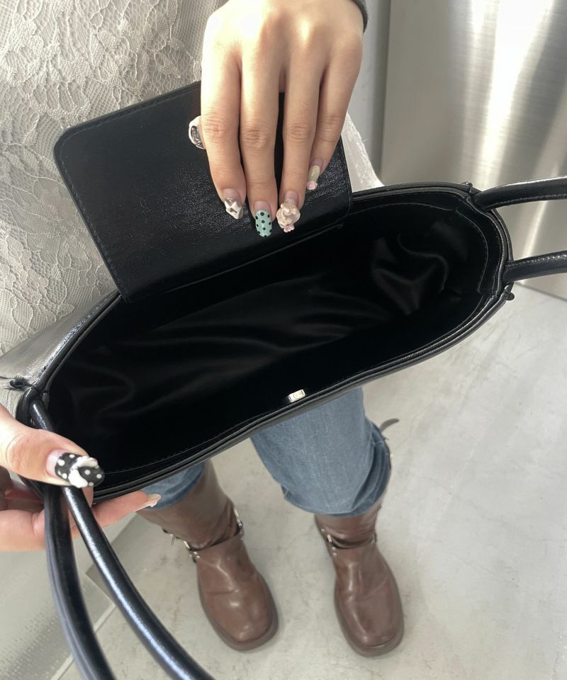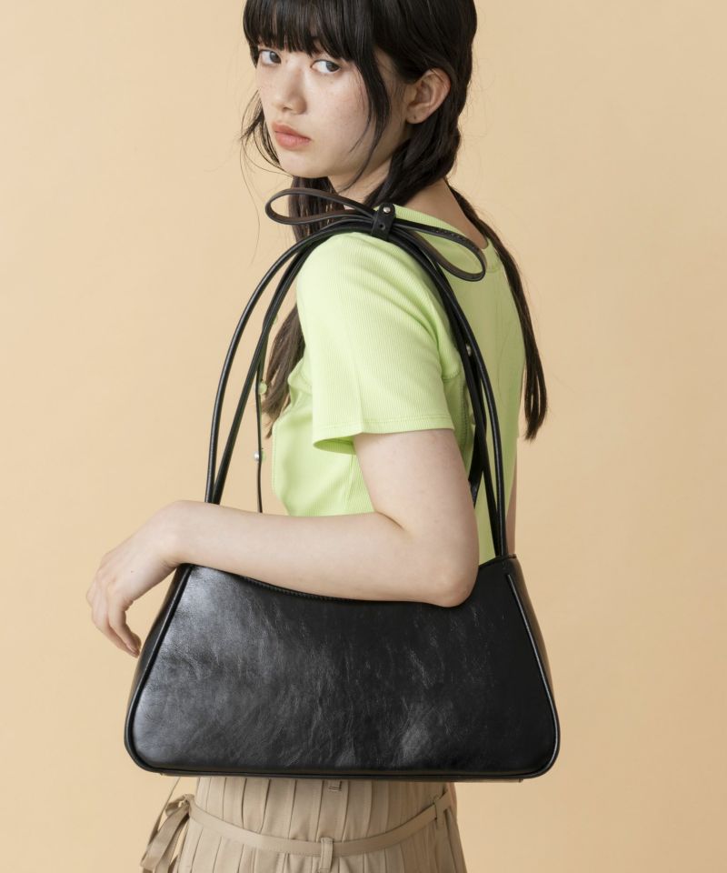 光沢感のある素材でシンプルながらスタイリングのポイントに◎