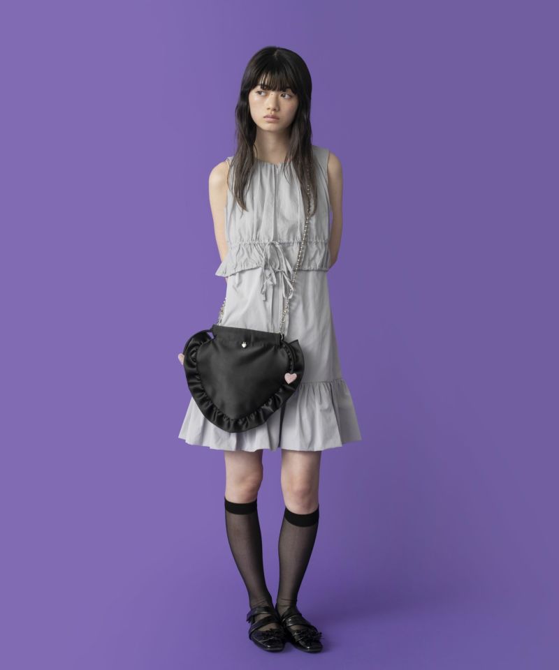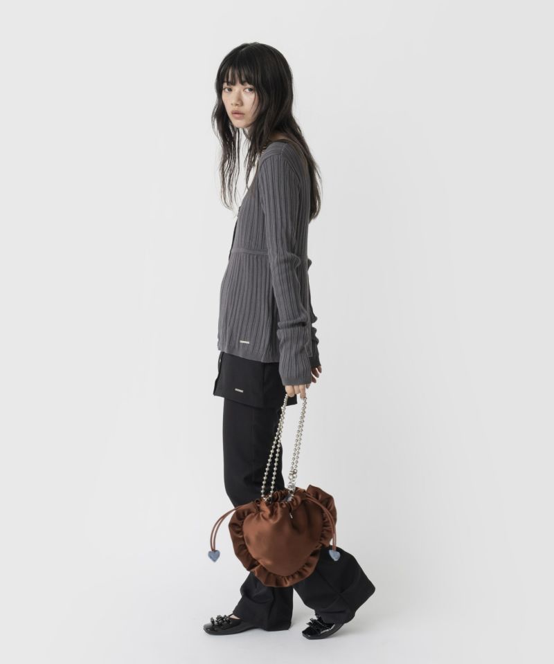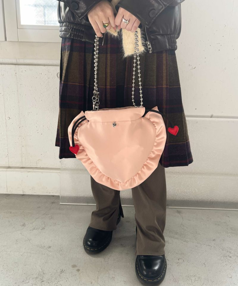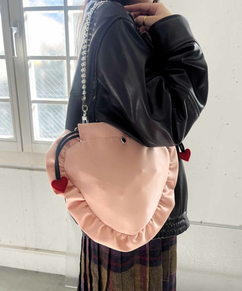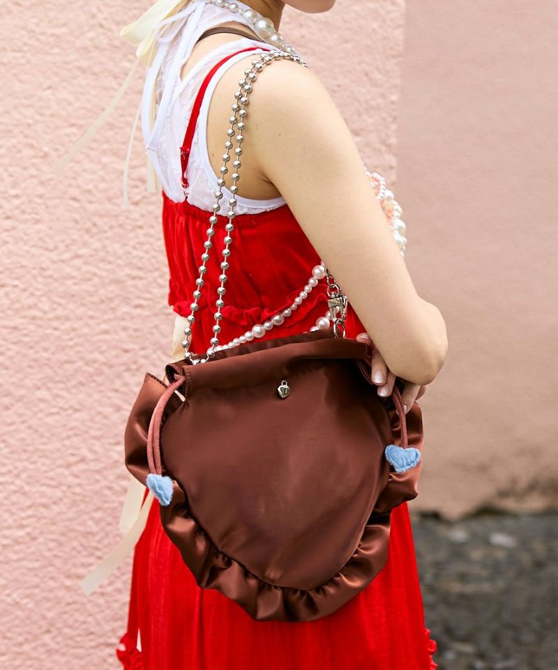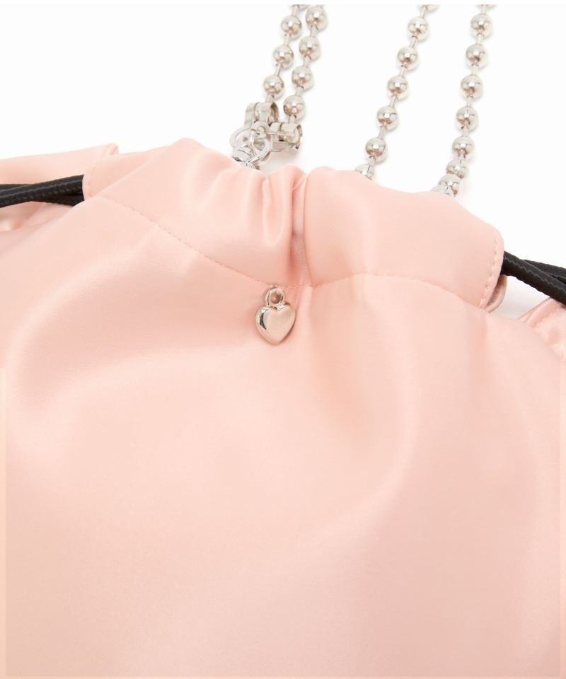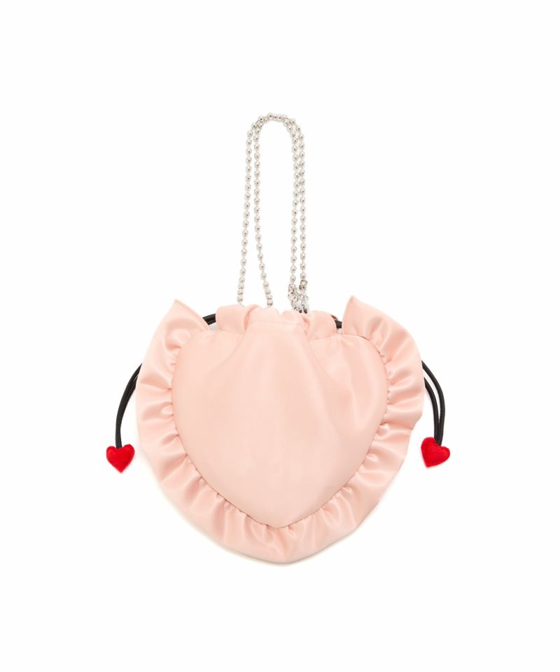 口元をしぼるとハート型のシルエットになる、コロンとしたフォルムが目を惹く巾着BAG。