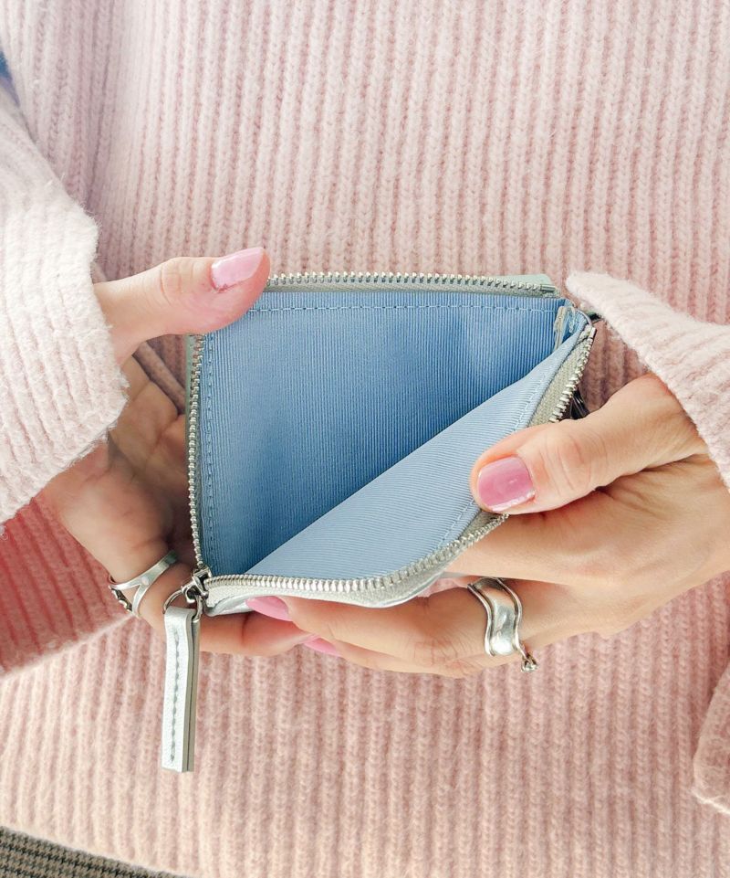 前はフラップポケット、背側にはファスナーポケットがついているためコインや、畳んだ状態のお札の収納も可能です。