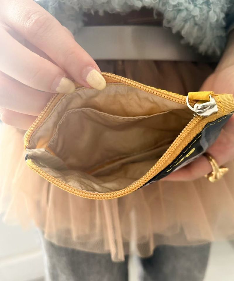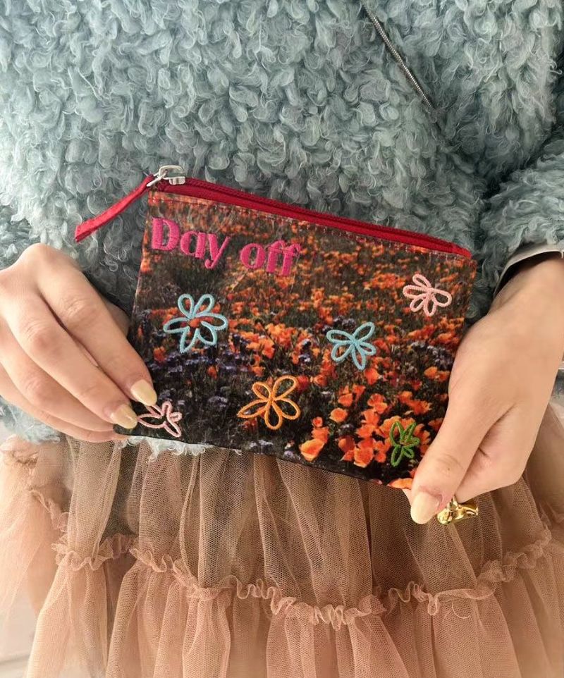 写真プリントの上からロゴやいたずら書きをイメージした刺繍をのせた、キャッチーなポーチ。