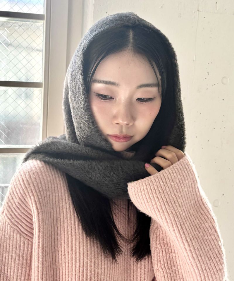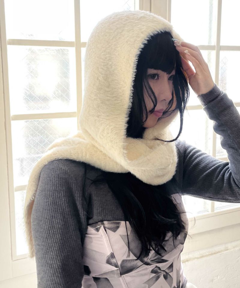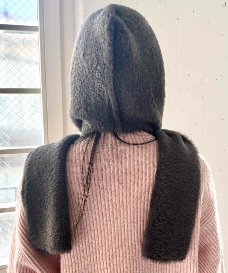 ふわふわとした肌触りの良い糸を使用したフード付きのマフラー。
