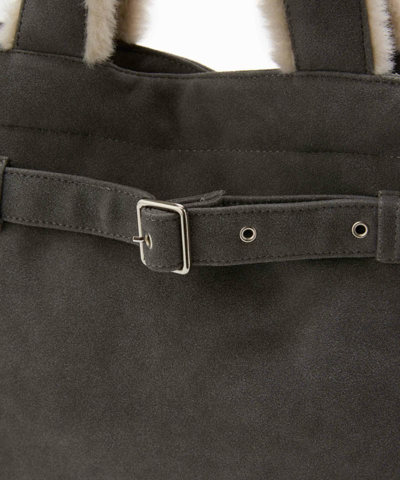 あたたかみのあるフェイクファーと、ベルトデザインが目を引くトートバッグ。