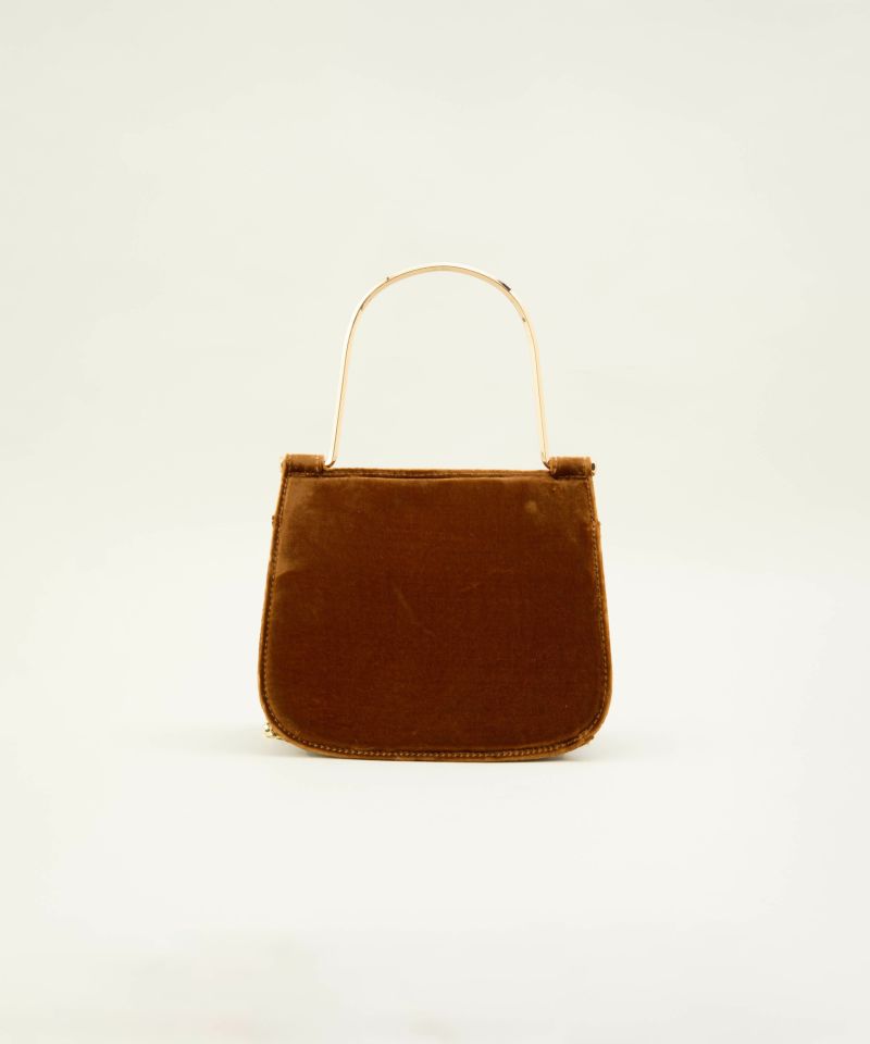 曲線を描くメタルハンドルが印象的なデザインバッグ。