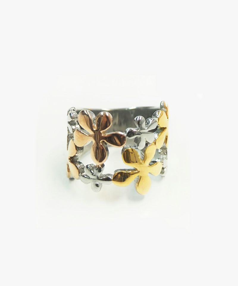 フラワーモチーフを繋いだ存在感のあるデザインのリング。 メタルが醸し出す大人な雰囲気と、小振りなお花モチーフの可愛らしさのコンビネーション○ ミックスカラーが華やかで、シンプルコーデのアクセントになってくれます。