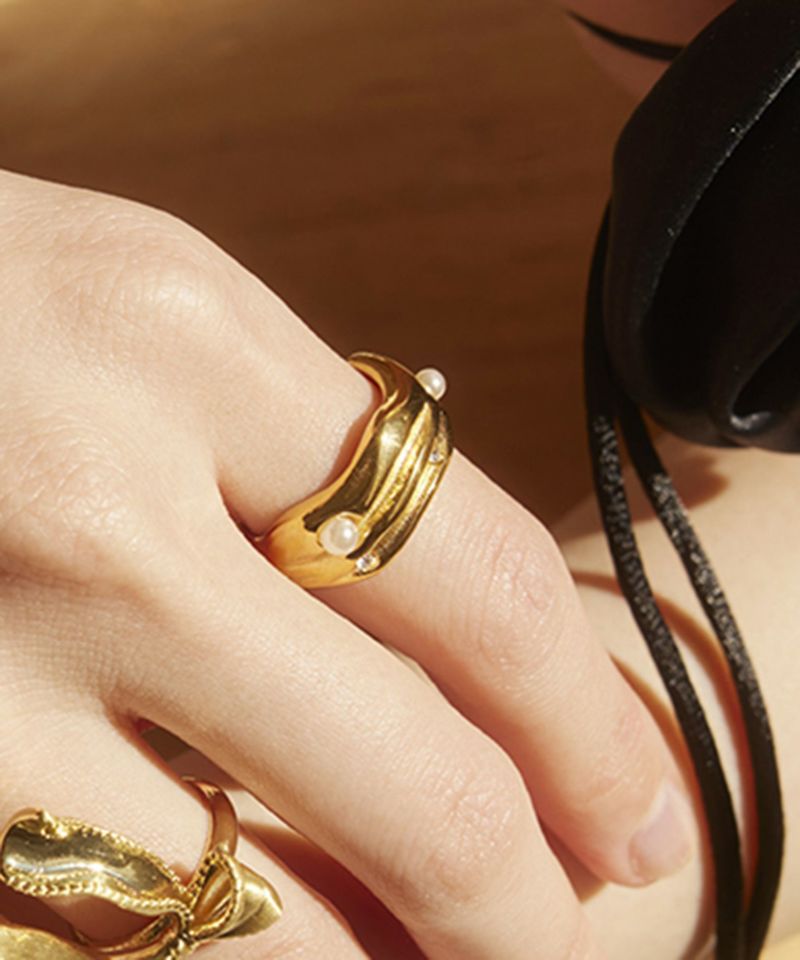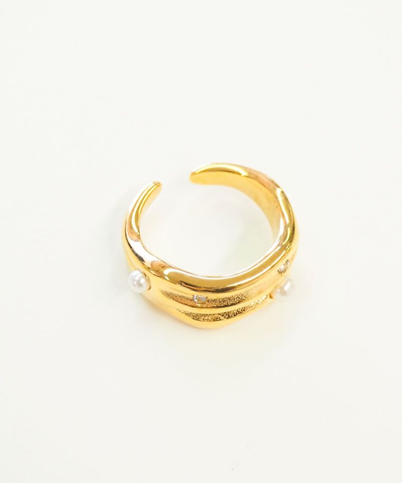 繊細なパールビーズがついた、綺麗めにもカジュアルにも使いやすいリング。 太めのリングが、しっかりと存在感がありつつも上品な印象に♪ 単品使いではもちろん、お手持ちのアクセサリーと組み合わせての使用もオススメです。