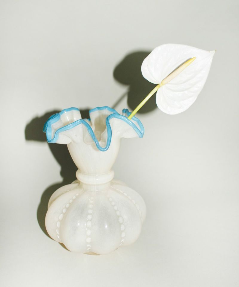 鮮やかなカラーとアンティーク調のシルエットが特徴的なガラス製フラワーベース。