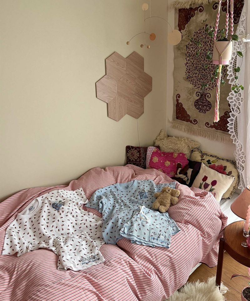 可愛らしい色合いと柄の組み合わせが目を惹くルームウェアです。