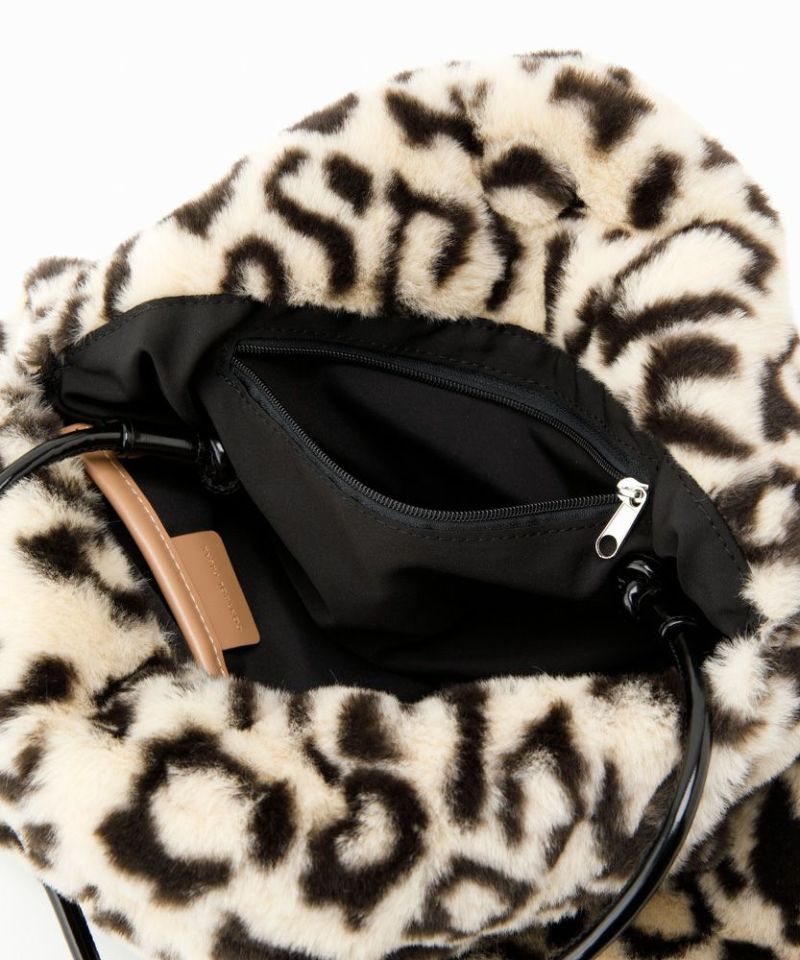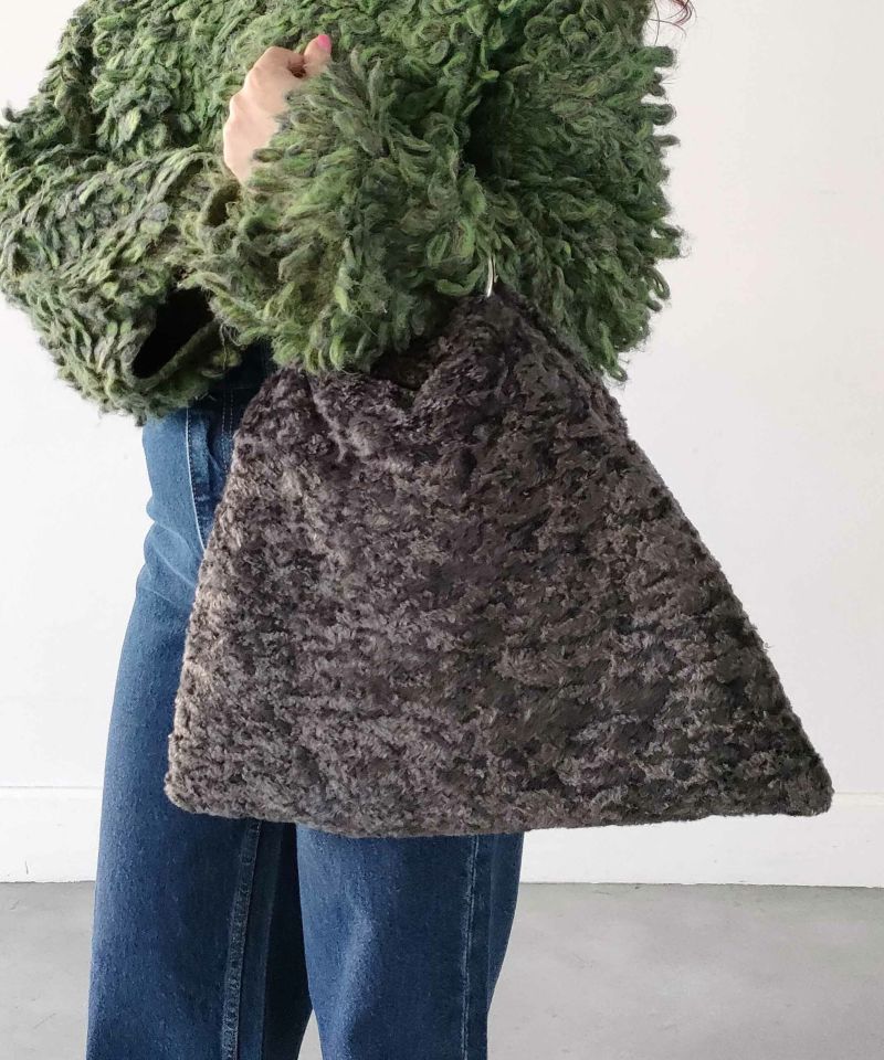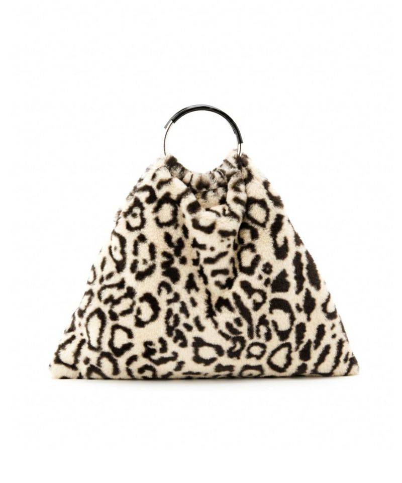 フワフワのカラーファーのボディにメタルのリングハンドルがポイント。