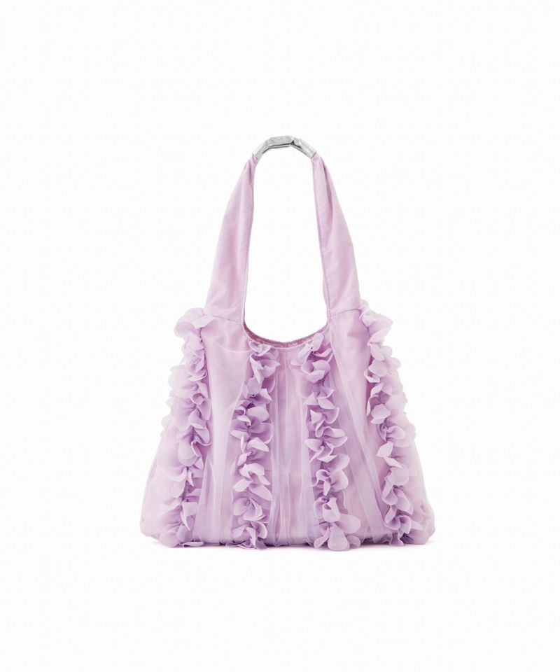 フラワーパーツをフリル状にした、ゴージャスなテープをふんだんに使用したトートバッグ。 甘いフリルにナイロン素材を取り入れることで、甘すぎず程よいカジュアル要素をプラス。 春夏のレジャーシーンが楽しくなるデザインです!
