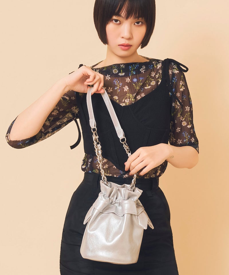 使い勝手のいい自立する巾着型のショルダーバッグです。口元はゴム仕様で開閉しやすく、物の出し入れもスムーズです。