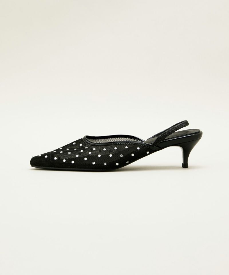 エレガントな雰囲気を演出するシアー素材のミュール。 光が当たるたびに煌めくビジューディテールをプラスし、華やかな一足に仕上げました。 きちんとした印象がありながらも気負わずに履きやすい一足です。 ・スタイリングを女性らしく仕上げてくれるミュール ・エレガントなムードを引き立てる華やかなシルエット ・ヌーディな抜け感が大人の余裕をプラス ・ゴム仕様のバックストラップで、スムーズな着脱 ・バランスの取れた4.5cmのヒール