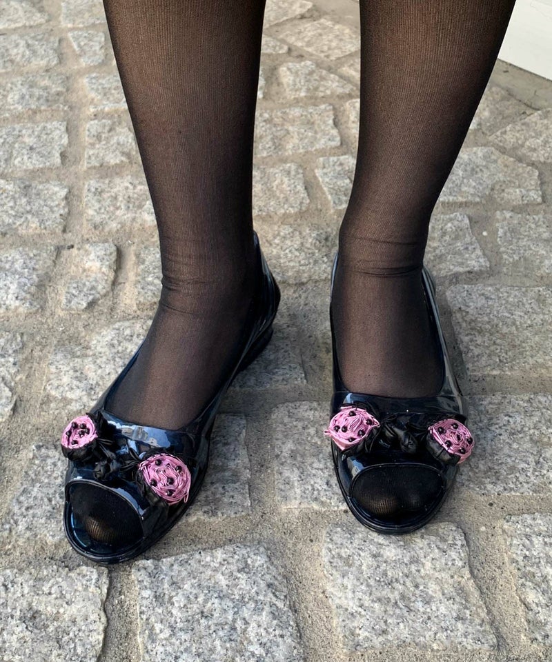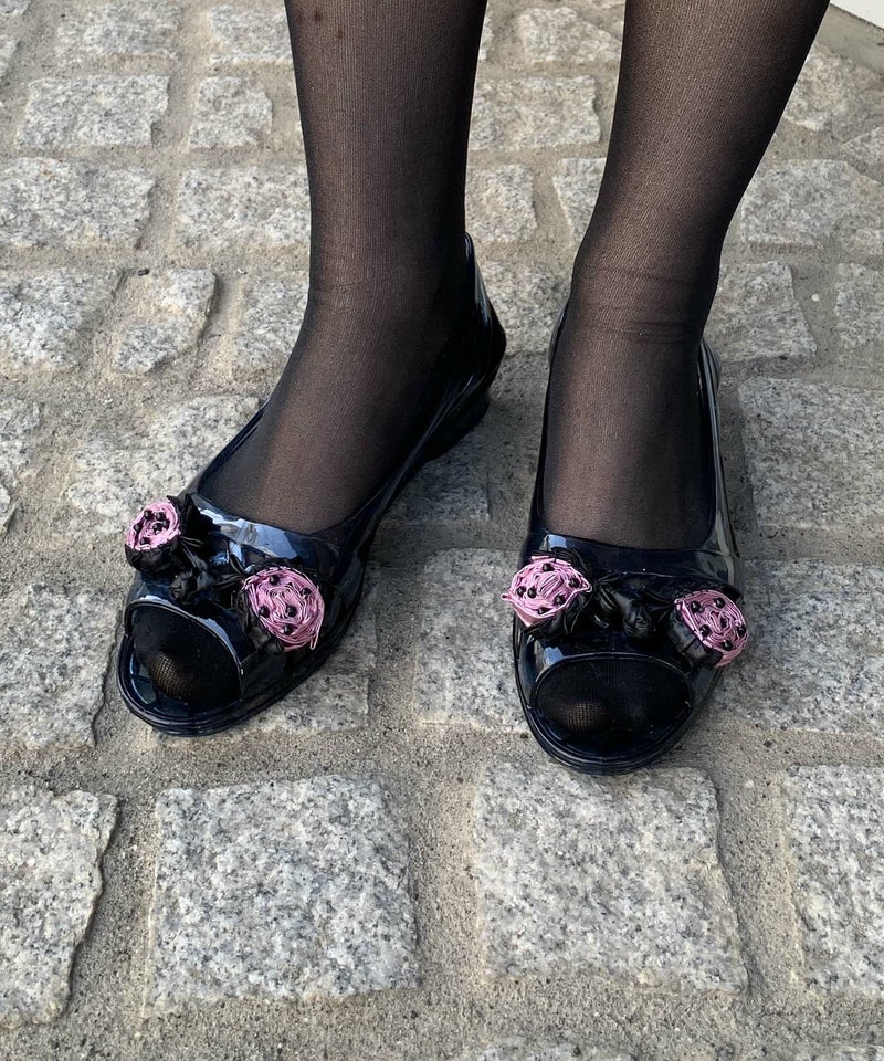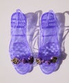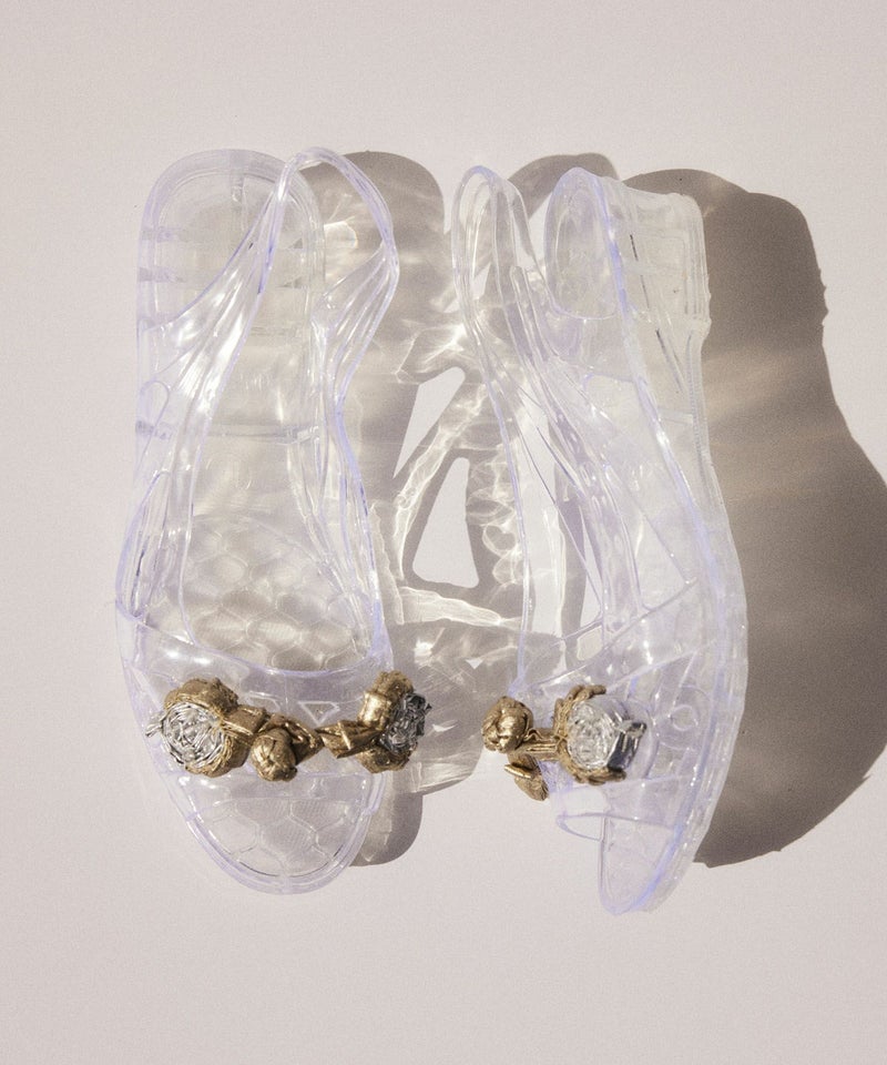 レトロなクリアサンダルに今回はメタリック素材で、いちごを模したチャイナボタンを取り付けました。