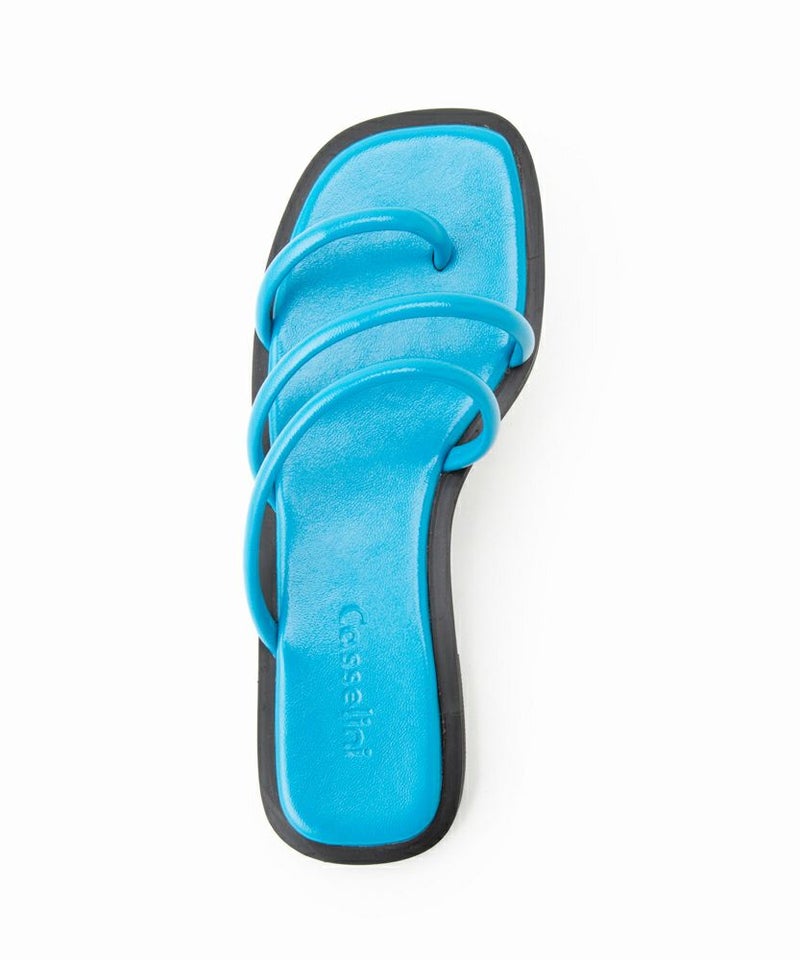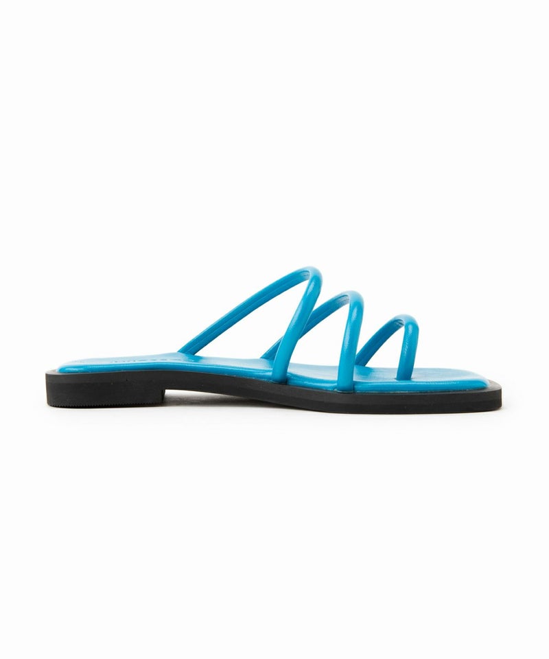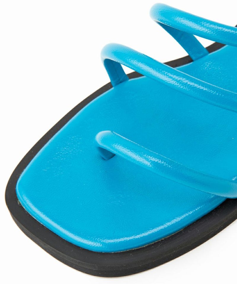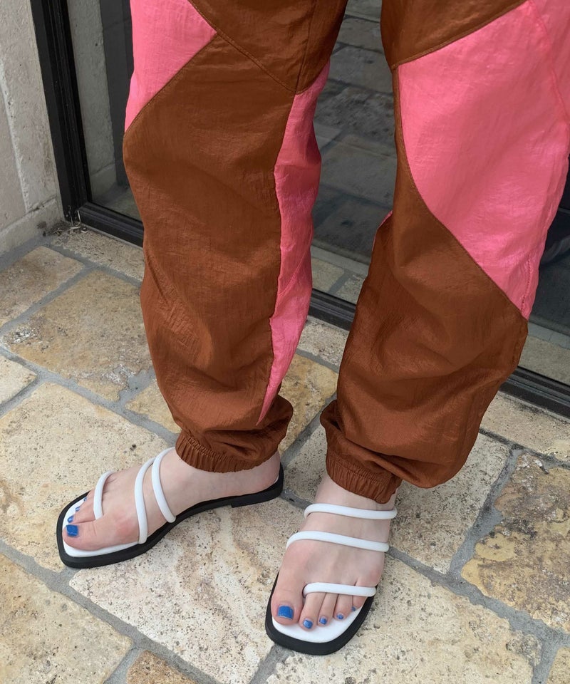 パンツの裾から、ちらっと見えるカラーのストラップは、コーデのポイントに!