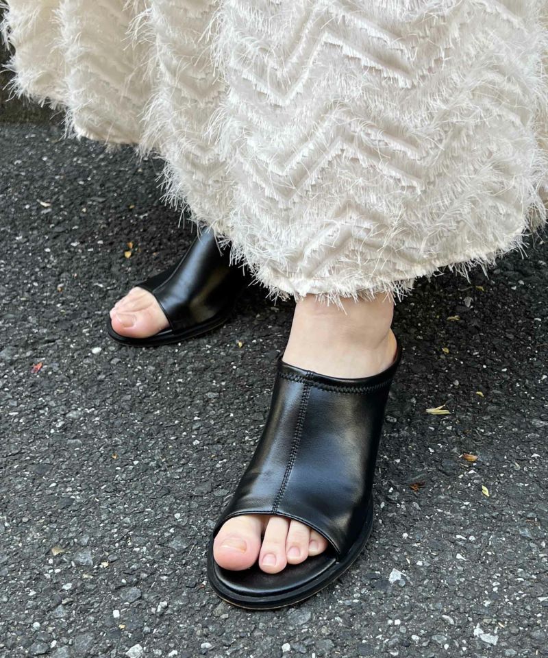 ストレッチミュールの履き心地の良さはそのままに、今季はラウンドトゥと特徴的なヒールに大きくアレンジしています。