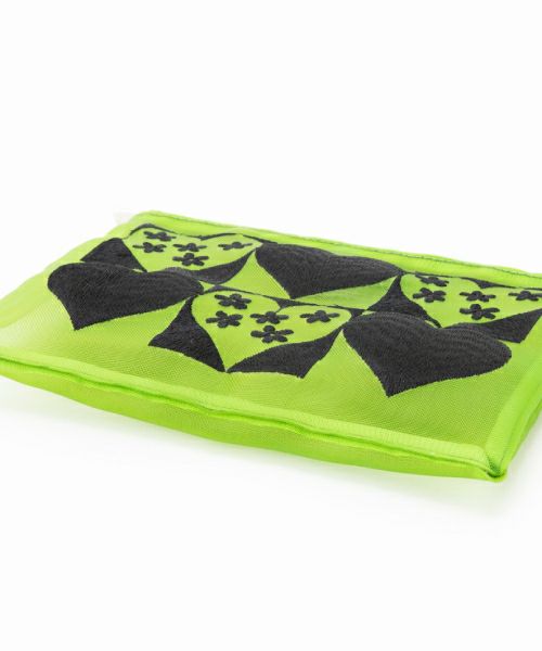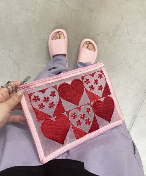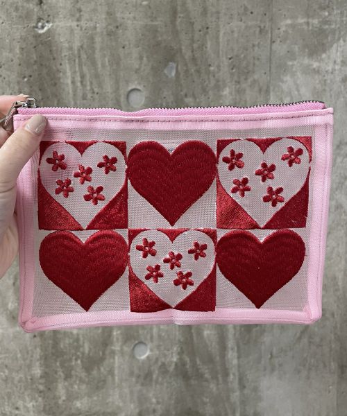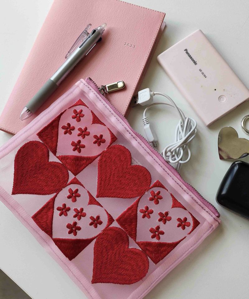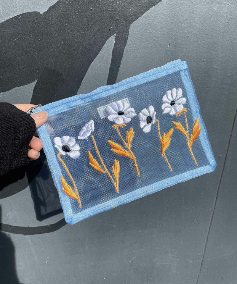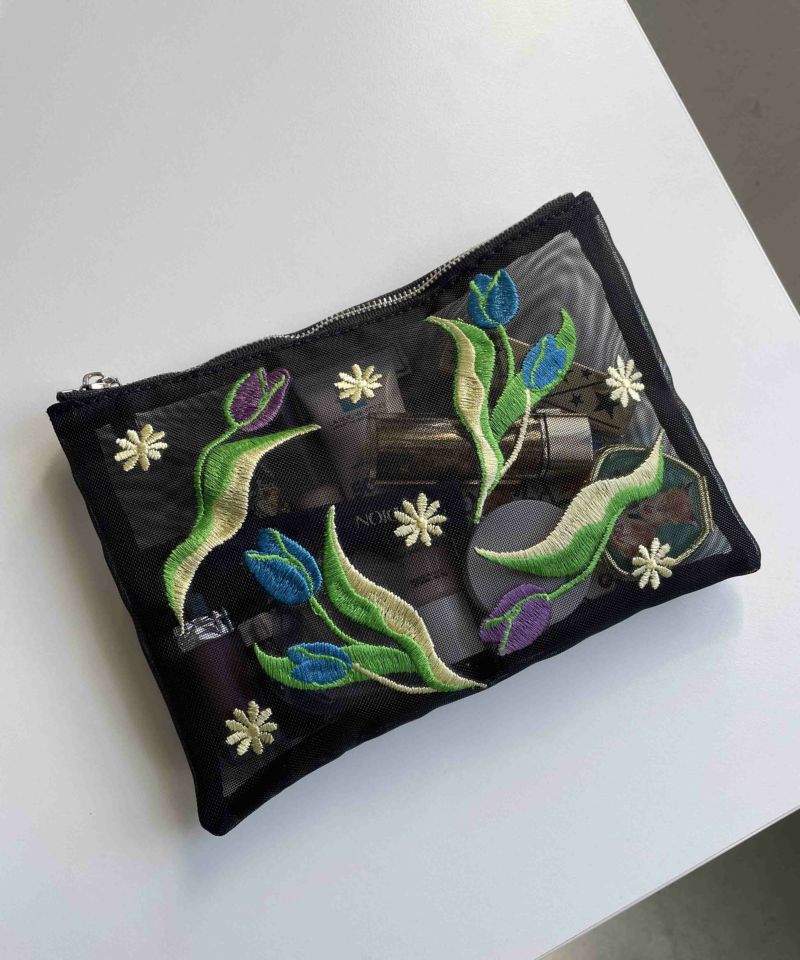 大人気の、ハリのある丈夫なチュールにお花モチーフの刺繍を施したポーチ