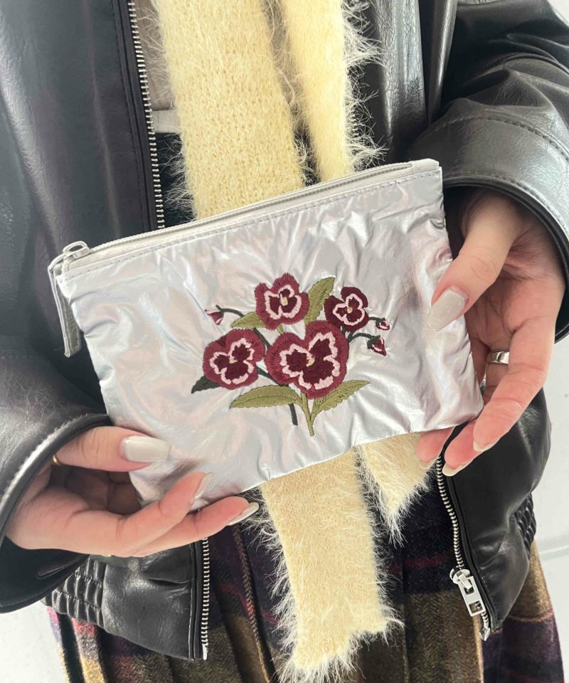 スポーティーなナイロン生地とロマンチックな雰囲気の刺繍のMIXデザインが魅力のポーチ。