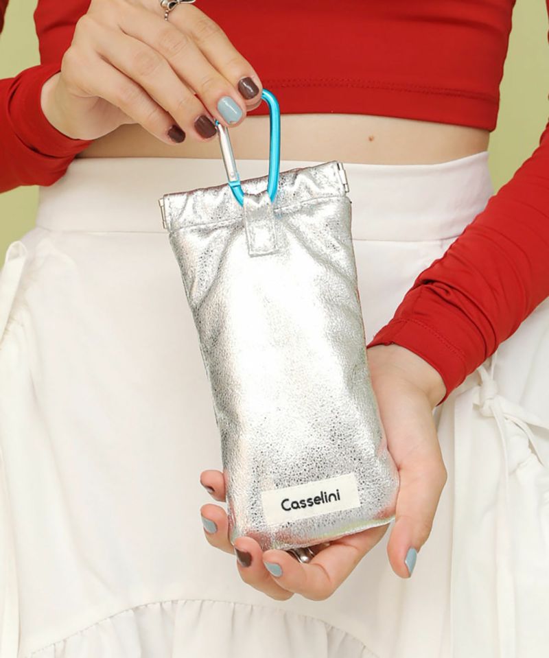 Casseliniらしい刺繍を施したサングラスケースは、カラビナでバッグに取り付けて、チャームのように使用しても◎