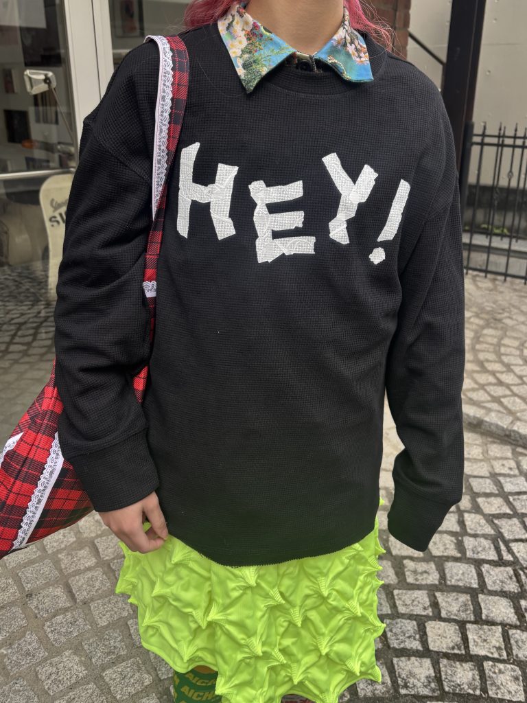 「HEY!」の文字をマスキングテープで貼ったみたいにプリントした、テンション高めなサーマルロンT。