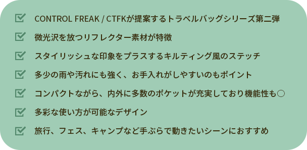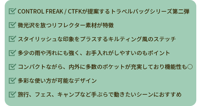 Q. CONTROL FREAK / CTFKトラベルバッグの魅力は?