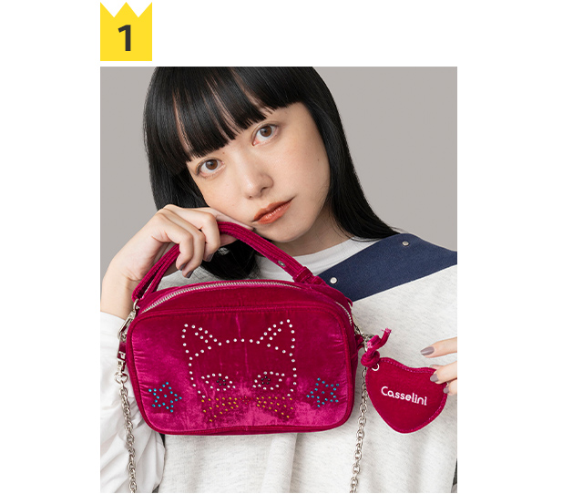 1 [Casselini]HOTFIX miniBAG ¥9,900→80%OFF!¥1,980(in tax) ベルベット素材の光沢感とラインストーンモチーフが華やかな印象のショルダーバッグ。 ハート型のミラーチャーム付き。 ミニマルなデザインながらマチがしっかりあり、最低限の荷物や必需品をいれてアクセサリー感覚で着用可能◎ 取り外し可能のハンドルパーツとチェーン付きで、コーディネートに合わせてアレンジを楽しめるのも嬉しいポイントです。 ちょっとしたパーティから普段使いまで幅広くお使いいただけます。