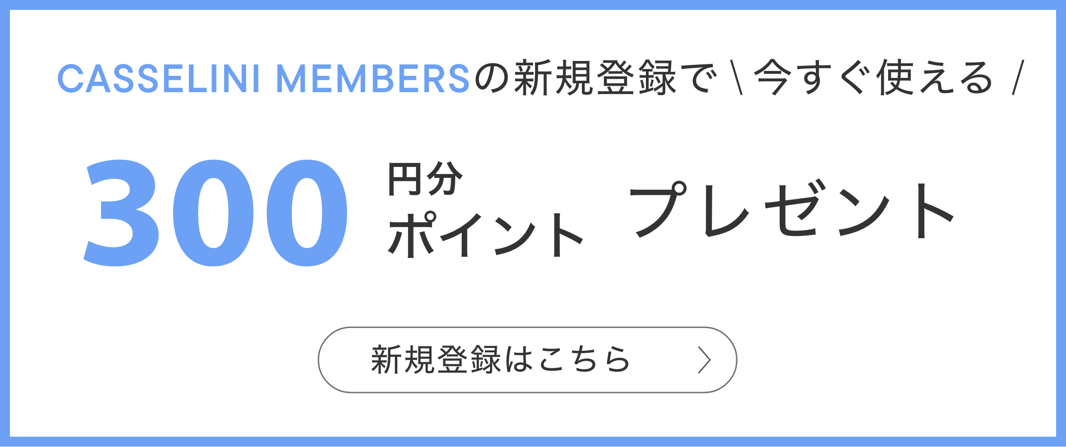 購入金額に応じて、次回のお買いものからご利用いただけるポイントがたまります。1 ポイント = ¥ 1 として、ONLINE SHOPとCASSELINI原宿店にてご利用いただけます。さらに、商品レビューの投稿やポイントキャンペーンへの参加など、お買いもの以外にもポイントがたまるチャンスが満載です。 -